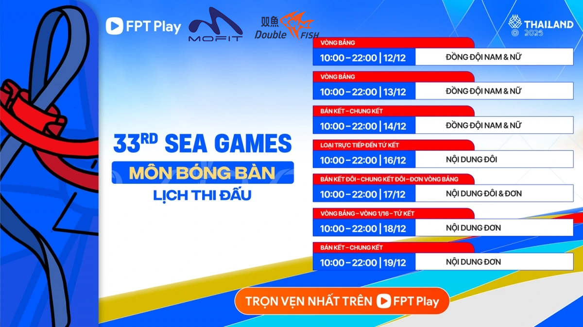 Môn bóng bàn tại SEA Games 33 diễn ra từ 12 đến 19/12 tại Nonthaburi, Thái Lan với 7 nội dung ơn nam, đơn nữ, đôi nam, đôi nữ, đôi nam nữ, đồng đội nam, đồng đội nữ.