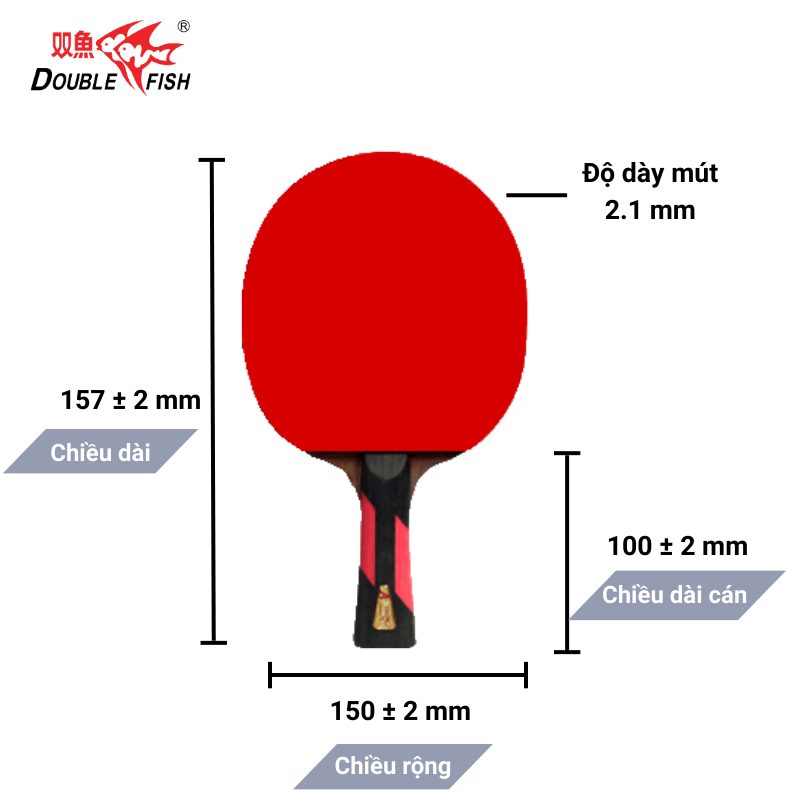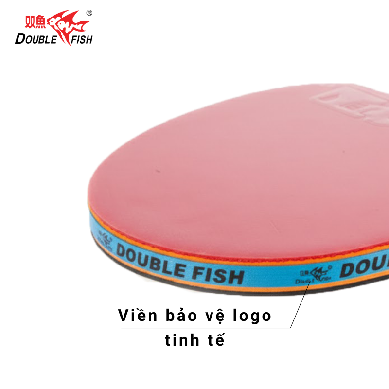 Viền vợt: Băng bảo vệ xanh dương sáng, in chữ Double Fish chạy quanh mép.